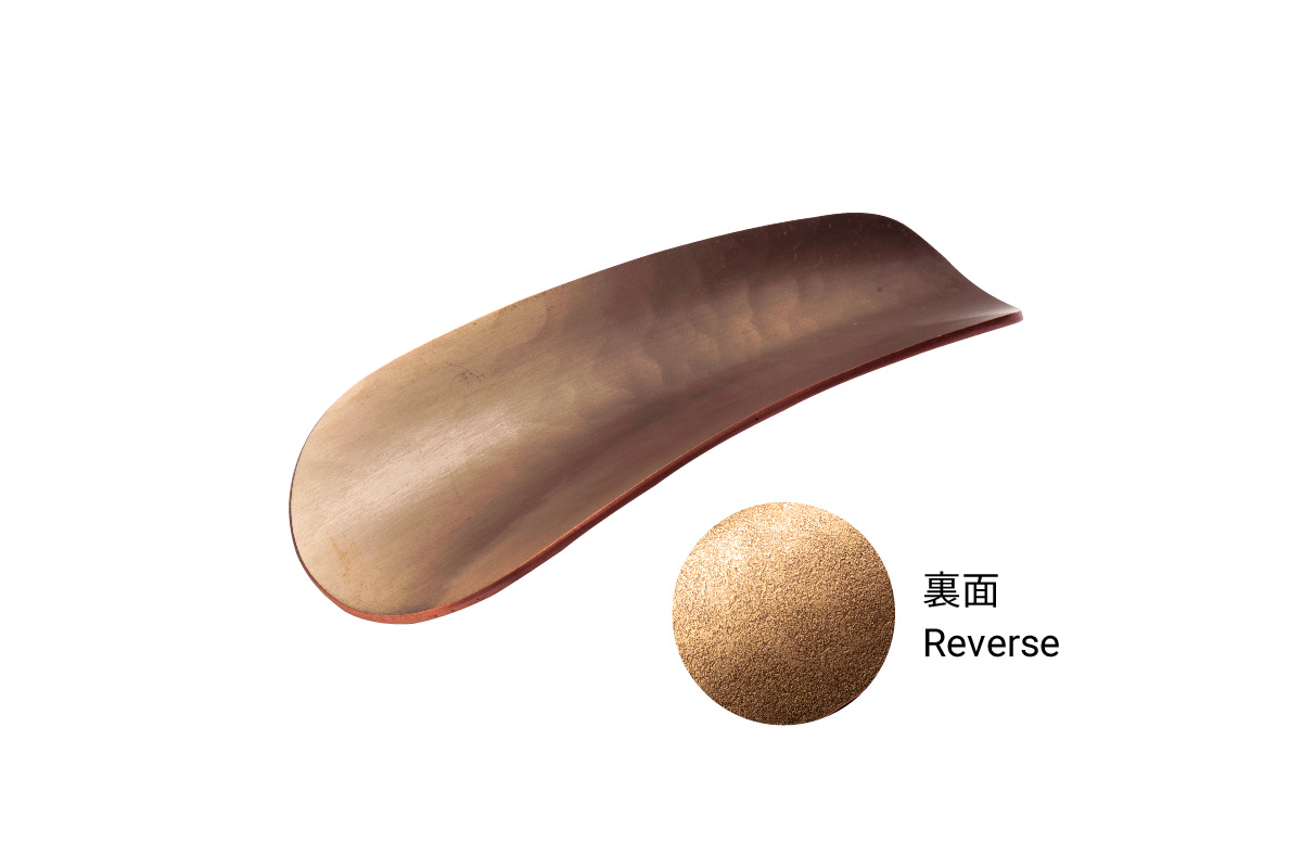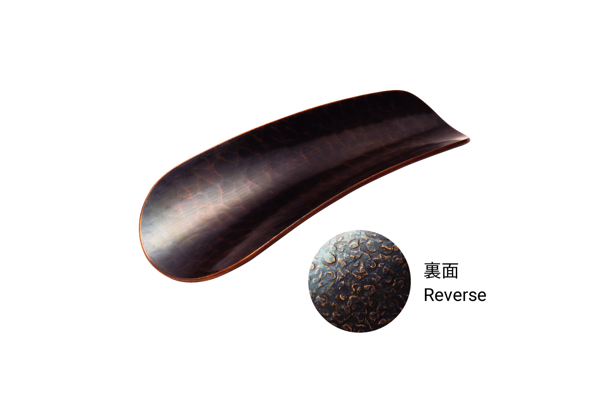 フラワーボール 手の平におさまる小さな丸い一輪生 道端の小さな花も気軽に挿して O20-0555 フラワーボール 海(紫金色) 高50×胴張60mm ¥39,000+税 O20-0554 フラワーボール 陽(金色) 高50×胴張60mm ¥39,000+税 O20-0556 フラワーボール 月(黒銀) 高50×胴張60mm ¥39,000+税靴べら ビジネスのシーンにも鎚起銅器のエッセンスを 使い込むことで表れる鎚目の表情や色合いは、 道具を持つ喜びをもたらします P10-0204 靴べら 銀色 縦97mm×横39mm ¥12,000+税 P10-0203 靴べら 紫金色 縦97mm×横39mm ¥12,000+税