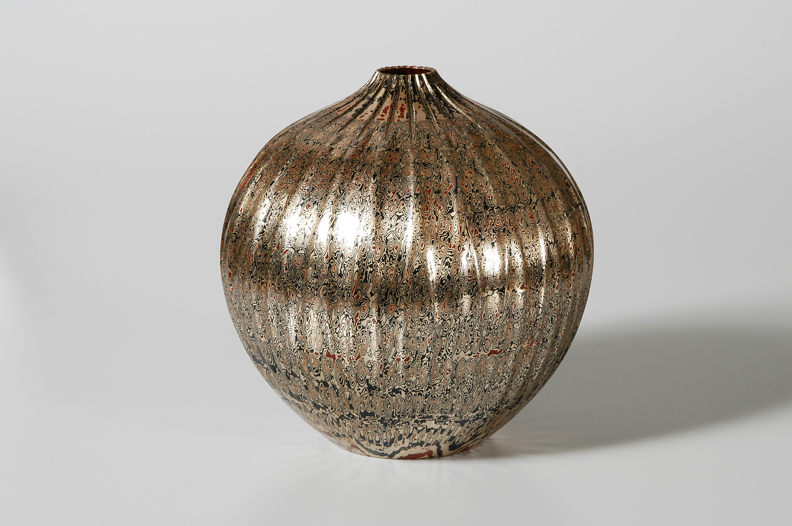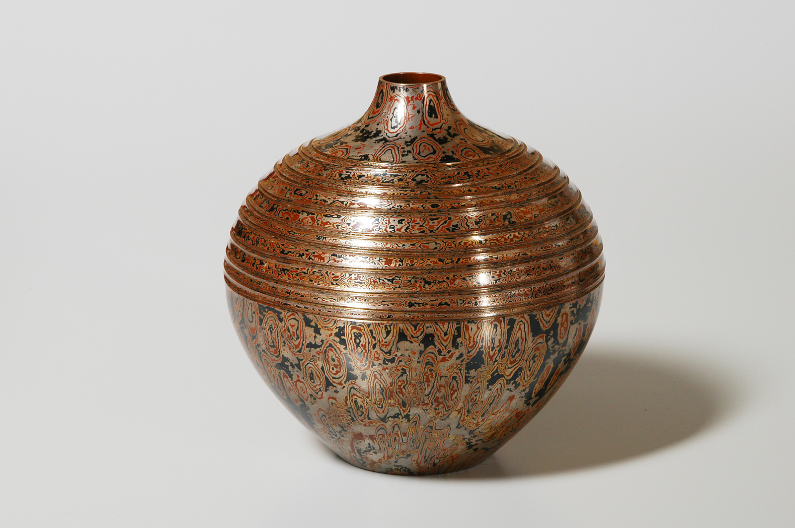 經由玉川宣夫的巧手鍛造,金屬塊中的疊合層會隨著敲打流動延展,或因敲擊而膨脹擴展,展現出複雜多變的木目金紋理。